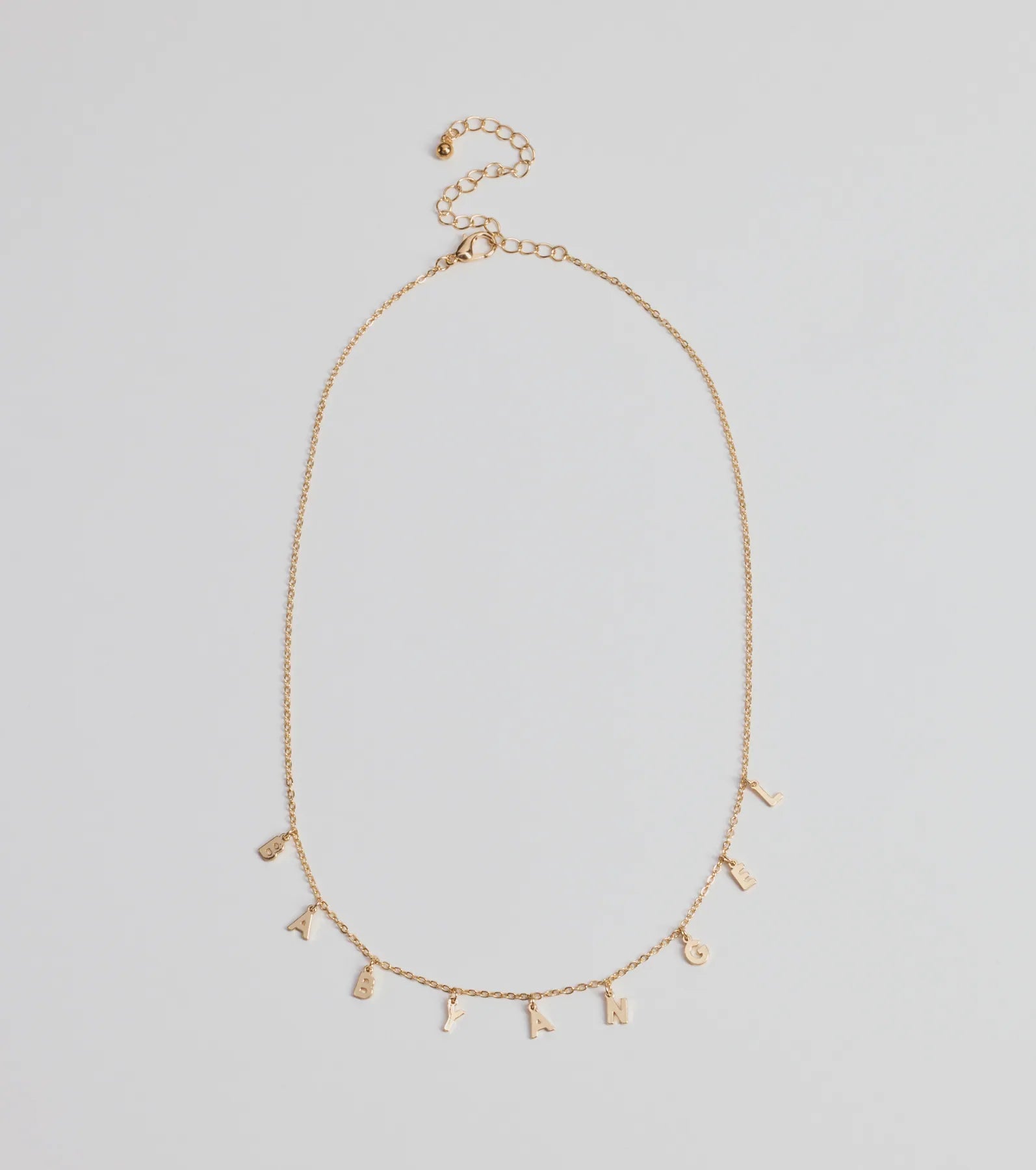 This dainty chain necklace features letter charms that spell out 'Baby Angel'. Perfect for styling with a mini dress for any occasion.