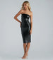 You'll look like bae tonight in this sexy faux leather midi dress! Featuring a strapless neckline, seam detailing down the front for a contour effect, a flattering bodycon silhouette, and a center back slit along the midi-length hem. Complete the look in sleek hoop earrings and heels for a birthday or night out!