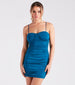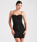 Show your sweet side for date night in this mini dress featuring a sleeveless, sweetheart neck, spaghetti straps, a lightly padded bust, side ruching, and a bodycon silhouette on lined knit fabric that fits your body like a glove. Complete the look in a chic ring set and heels.