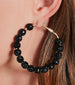Be rare tonight in these statement hoop earrings that feature a sleek metal hoop with multiple rhinestone ball decorations and an omega closure. Complete the look in lace-up stiletto heels for a concert and after-party!