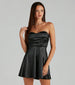 Show up ready to swoon every heart in this satin skater dress at parties! It features a strapless sweetheart neckline with non-slip grip lining, a pleated bust overlay, an eye-catching strappy lace-up back, and a short-length hem. Complete the look with a rhinestone choker and earrings!