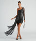 Always the center of attention. Sparkle from the moment you strut into the party in the Beatrice glitter formal dress! Encapsulate an elegant and chic allure in her one-shoulder neckline with a sheer long sleeve, fitted bodice, and a high waist seam featuring a cascading drape on her mini-length, bodycon silhouette. The formal dress is composed of a glittery mesh fabric with a knit lining and minimal stretch. Complete your dressy look in stiletto heels and a clutch.