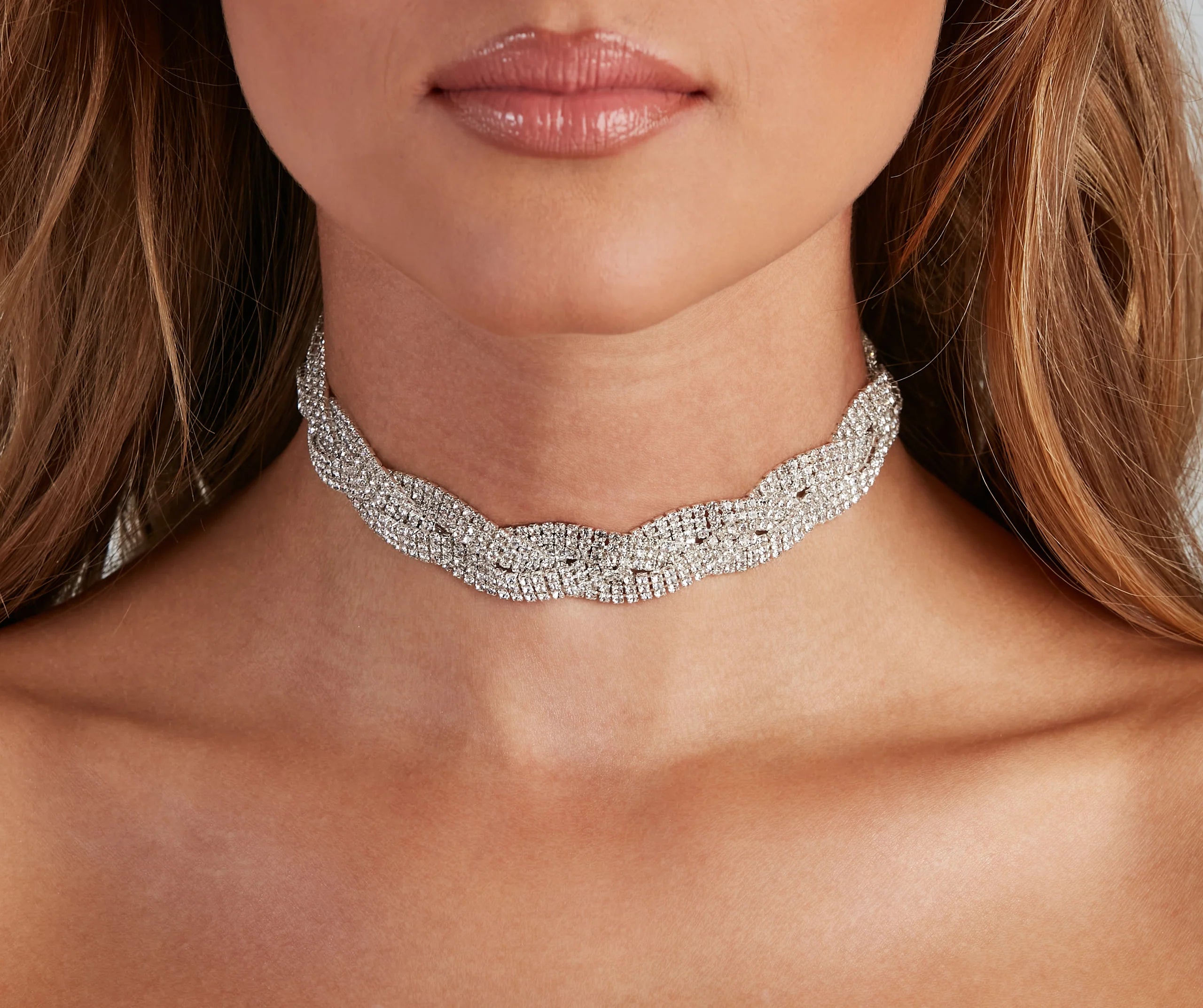 Shine like the beauty queen you are in this rhinestone braided choker. Complete the look in an elegant off-the-shoulder long dress and heels.