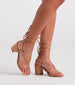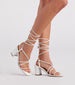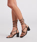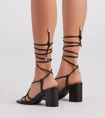 Put your best style forward in these eye-catching block heels featuring a square toe, and a strappy design that leads to the lace-up ankle on sleek faux leather material. Complete the look with a mini handbag for a dinner date!