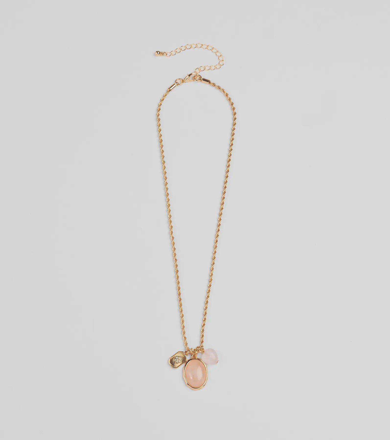 Create a boho-chic inspired look with this multi-charm necklace featuring a statement rose quartz a clear accent stone and a rhinestone-embellishment pendant. Pair with a cute jacket and booties.