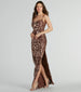 Bring luxe glamour to prom, galas, or your next black-tie affair in the Bronwen high slit sequin mesh formal dress! Crafted with shimmering sequin embroidery in a chic intricate scroll pattern on the lined mesh fabric, this formal long dress will give you the wow factor you love. Her bodice is shaped with a sleeveless scoop neckline with a built-in padded bust and stretchy bungee spaghetti straps that lead to a hidden back zipper closure. Her high-cut front slit will add a sultry allure to the glamorous slim-fit silhouette. Complete the look with rhinestone chandelier earrings and stiletto heels.