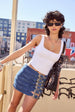Elevate your style in this statement high-rise denim skort showcasing buckle detailing that flaunts a cute Western vibe!