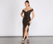 Our stunning Cairo woven glitter dress is such a show-stopper! Her remarkable shine will have you second-guessing what hue she is. She features an off-the-shoulder V-neckline with a wrap-front design, short fitted sleeves, ruching at the waist, and a floor-length asymmetrical wrap skirt creating a sultry side slit. Complete the look with sleek hoop earrings.
