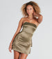 Play up the cargo trend in this satin mini dress! Crafted from silky smooth satin, this mini dress will have you feeling oh-so-luxe. It features a strapless foldover neckline with a non-slip grip lining, four side flap pockets, and a flattering bodycon silhouette. Complete the look in hoop earrings for a night on the town!