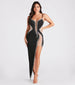Designed to give the illusion of an hourglass figure, the Carla formal dress enhances your curve appeal while radiating glamour! Perfect for galas, award ceremonies, and dressy cocktail events. She features a sleeveless V-neckline with a nude sheer mesh insert, adjustable spaghetti straps, sheer mesh nude inserts along the sides and at the hem, a hip-hugging slim silhouette, high side cutout, a long hem, and a rhinestone embellished pattern in a curve-flaunting design. The formal dress is composed of a crepe and mesh fabric with plenty of stretch. Complete the look with fringe earrings.