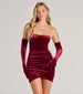 Strike everyone with your beauty in the Caroline velvet mini dress with gloves to create a show-stopping look for a formal or red-carpet event! She features a strapless neckline, flexible boning inserts along the bodice, side ruched seams that accentuate your curves, a bodycon silhouette, and a wrap-style mini-length hem. The velvet-lined party dress is designed with detached, mid-elbow-length finger gloves. Style with rhinestone heels for a glam touch!