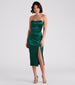 Love the sleek and sultry look? Then the stunning Casey formal midi dress is the one for you. She features a strapless neckline, a chic wrap-front bodice with structured boning to provide support, a high waist seam, and a fitted mid-length silhouette with a stylish front slit. Complete the look with strappy stilettos.