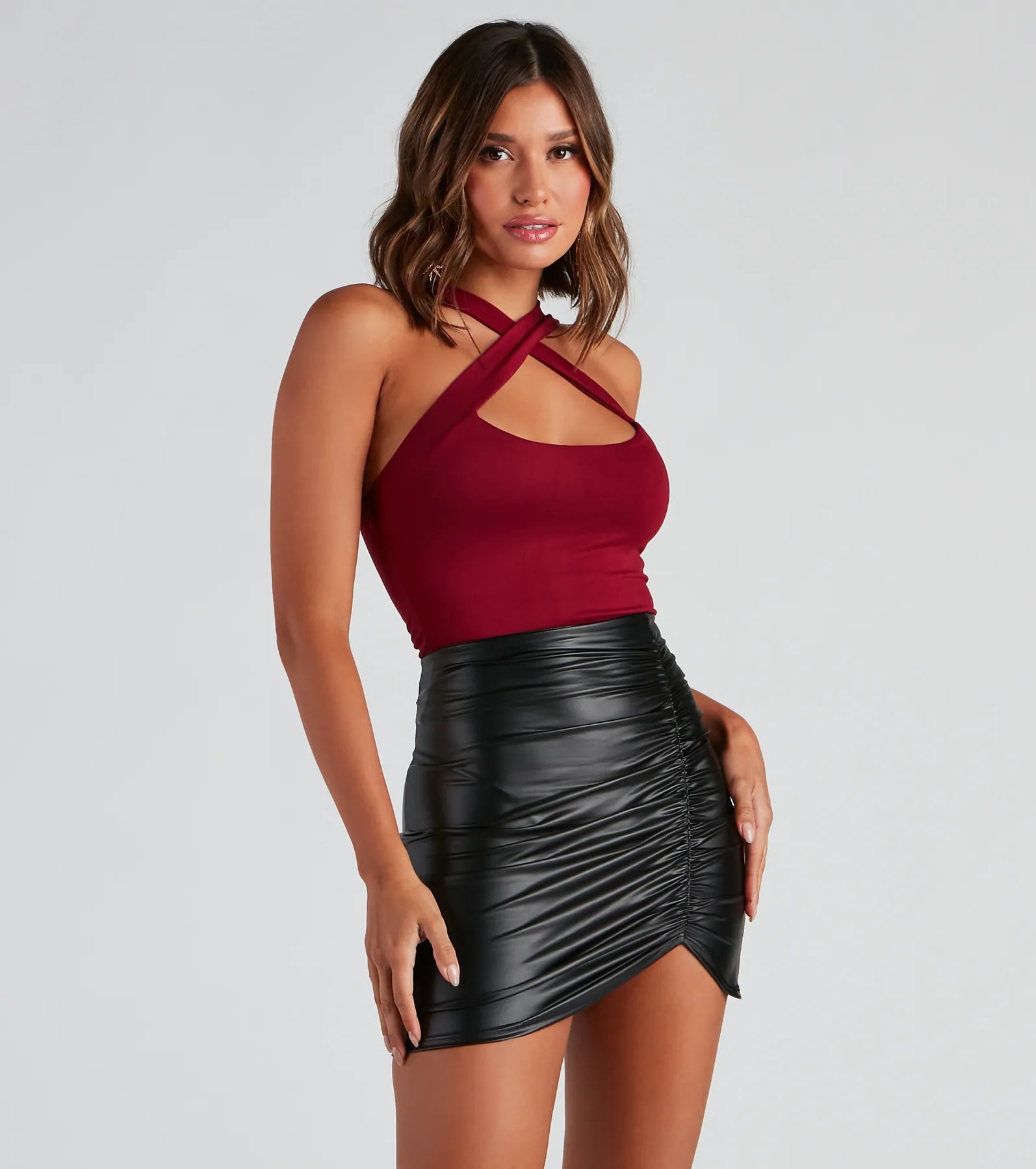 Show off a casual slay in this trendy halter top! It features a sleeveless bodice with cross-front straps, a center front keyhole cutout, and a mid-length, form-hugging fit. Style with a faux leather mini skirt and booties.