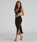 Make heads turn in this bold and alluring midi dress! It features a sleeveless crew neckline, tank shoulder straps, a major cutout at the bust, a center triangle accent, waist cutouts that lead to the back, and a midi-length, curve-hugging silhouette with a chic high side slit. Style this dress with strappy mules for a night out.