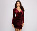 Dazzle and stun in a dress that is fit for a fashionista! Char features a wrap V-neckline, long puff sleeves that bring the drama, glitter details throughout, and a ruched ruffle accent that runs off-center. The dress is composed of a lined velvet fabric that offers a form hugging fit with a moderate stretch.