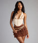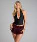 Look and feel charming in this lace skort designed with flirty ruffles and knit-fitted shorts for coverage. Pair with a jean jacket.