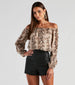 Showcase charming chic vibes in this trendy snake print blouse! It features an elasticized off-the-shoulder neckline, long sheer billowy sleeves with cinched hems, and a mid-length elasticized hem. The lined chiffon fabric features an all-over snake print pattern with a metallic lurex thread woven throughout for a hint of shine. Style with faux leather pants and booties.