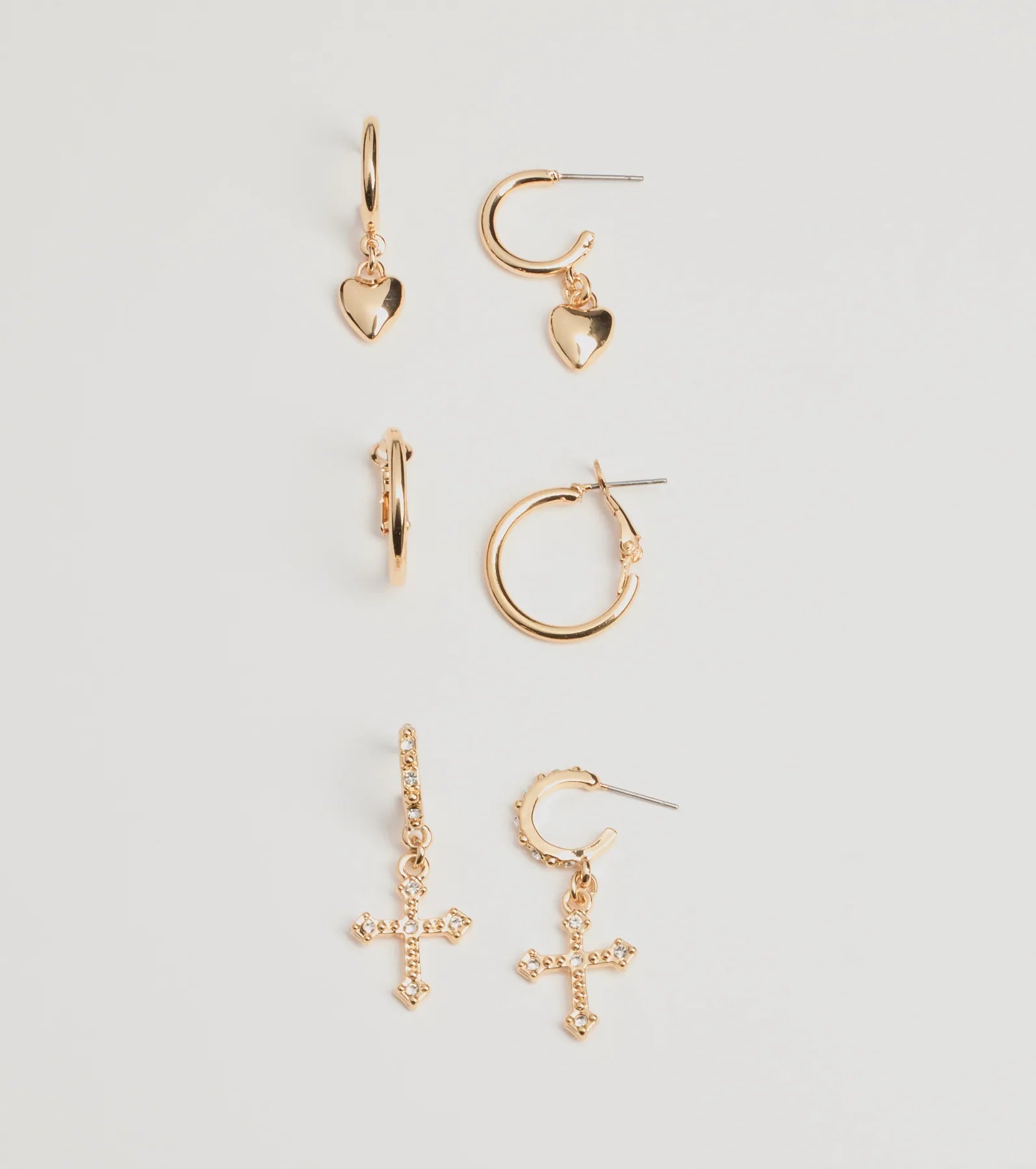 This dainty huggie hoop earrings set features a classic design, a heart charm design, and a rhinestone cross charm design for the perfect mix of chic and trendy. Pair with a layered necklace!