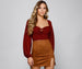Keep it chic with a cute crop top that is perf to dress up for a casual date with bae. The crop top features a sweetheart neckline with tie-front, long chiffon sleeves with elastic cuff, a smocked back, and a cropped hem. The top is composed of a lined chiffon and smocked knit fabric that offers a form hugging fit with a slight stretch. Complete look with mom jeans and mules.