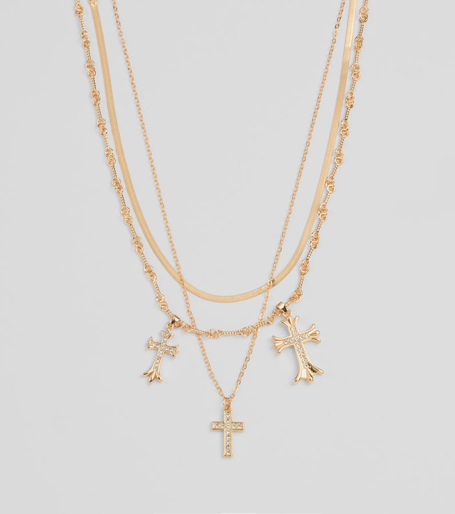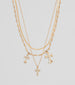 Count your chic blessings in this statement layered necklace featuring three rhinestone embellished cross charm on various styles of chains secured with a lobster clasp closure. Pair with a denim jacket.