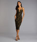 For nights that demand something unforgettable. This flocked floral velvet midi dress hugs every curve with a sultry halter neckline and sleek, body-loving fit.