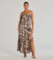 Enter the room in this chic boho satin maxi dress to make a bold impression! The sleeveless dress boasts a halter neckline and a flowy silhouette adorned with a high front slit. Style with stiletto heels.