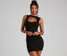 Keep your night out look chic and stunning with this bodycon mini dress. It features a high crew neckline, tank shoulder straps, a sultry cutout above the bust, and a short, curve-hugging silhouette. Style this dress with sleek hoops and strappy stilettos.