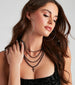You'll love the chic embellishments of this layered necklace set. It features four tiered rows with rhinestone embellishments, the longest row with a rhinestone cross charm at the center. Style this set with hoop earrings.