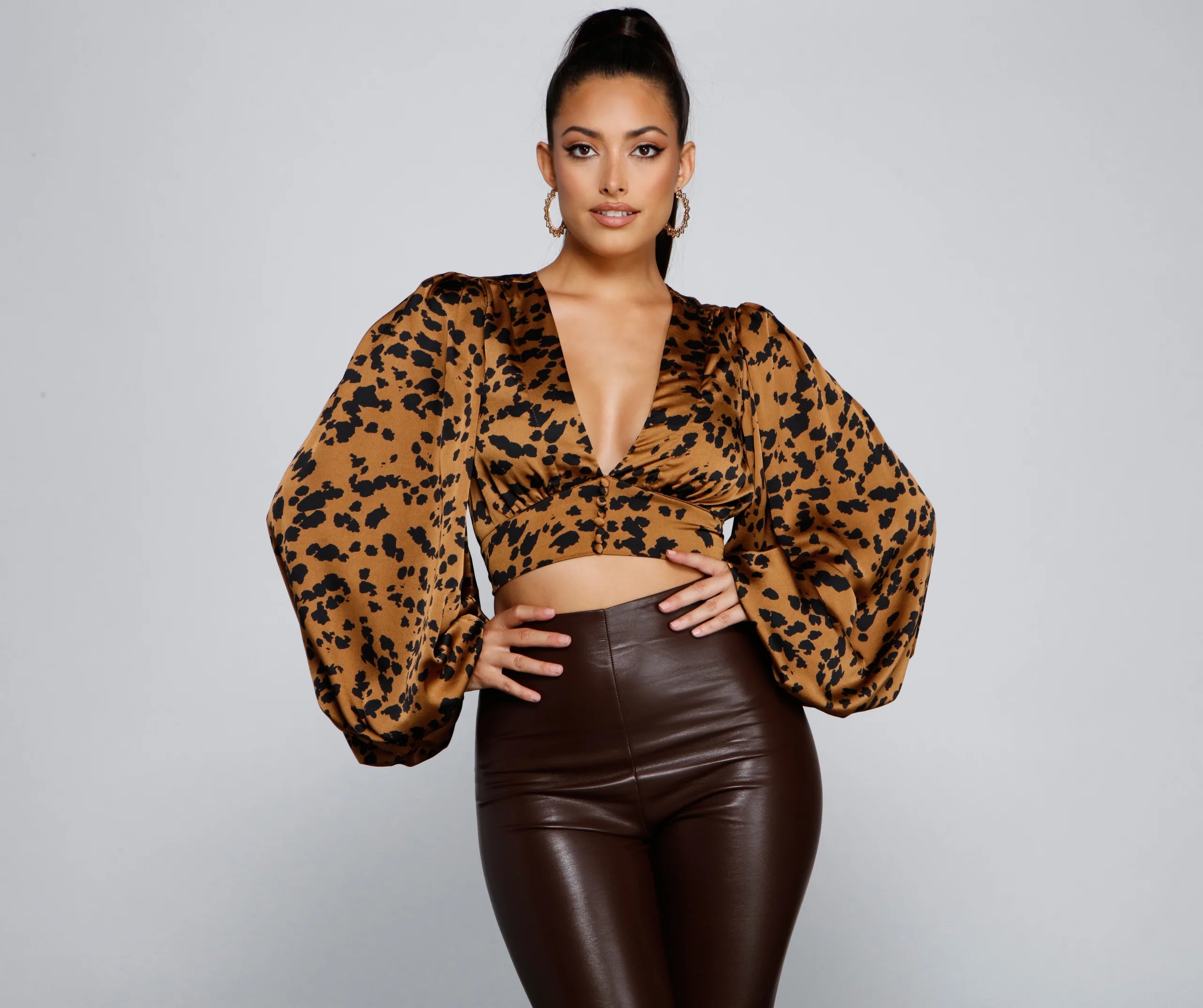 Achieve a chic look for the fall season with this on-trend crop top. It features long dramatic puff sleeves, a deep V-neckline, faux button details, and a cropped fit. The sleek satin fabric has an all-over leopard print for a stylish vibe. Complete the outfit with dark wash denim and mules.