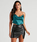 Get ready for a night out looking like you stepped off the runway in this satin crop top featuring a sleeveless cowl neckline, chain link straps with tie-neck closure, and an open tie-back closure. Complete your sultry look in a mini skirt and mules.