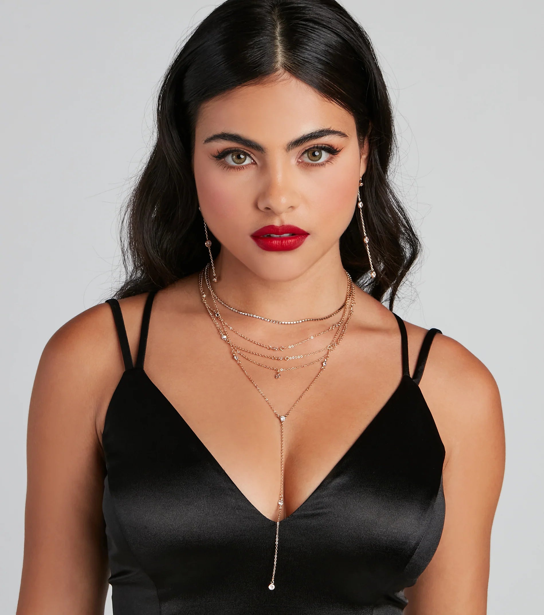 Give your outfit a chic peek of glam with this dainty layered necklace design with five lariat-styled layers, clear stone charms, and a lobster clasp closure. Complete the look in a low-cut long dress and clutch.
