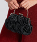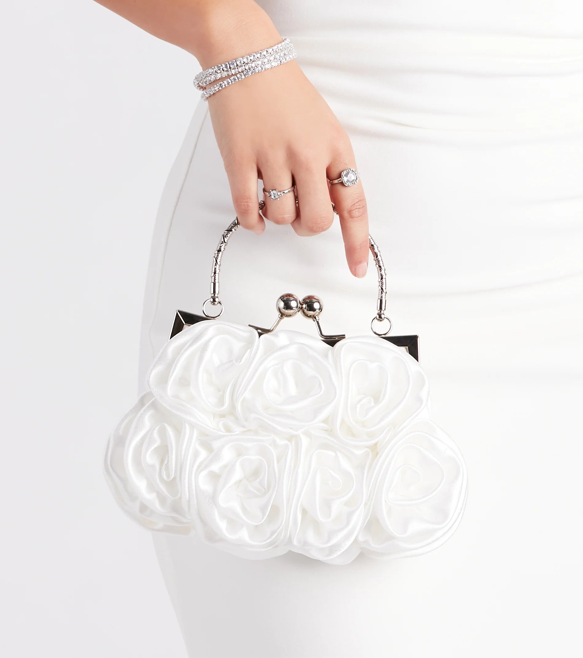 Capture a romantic vibe with this chic rose satin handbag! Featuring a textured metal top handle, a metal trim with a clasp closure, and a satin woven exterior with rose-shaped accents, this bag is perfect for date nights. Includes an attachable chain-link strap to convert it to a crossbody purse. Style with a dainty tennis bracelet.