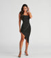 Showcase a chic sparkle in this fitted crepe midi dress. It features a sleeveless square neckline, adjustable spaghetti straps for a customized fit, a rhinestone embellished asymmetrical trim across the front, ruching, and a midi-length, form-hugging fit with an asymmetrical cut hem. Style with stilettos.