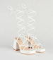 Showcase a chic strut in these cool-girl platform block heels. They feature an open square-shaped toe, a thin strappy design with knotted accents, lace-up straps that wrap around the leg, a platform sole, and a chunky block heel. Style with a mini handbag.