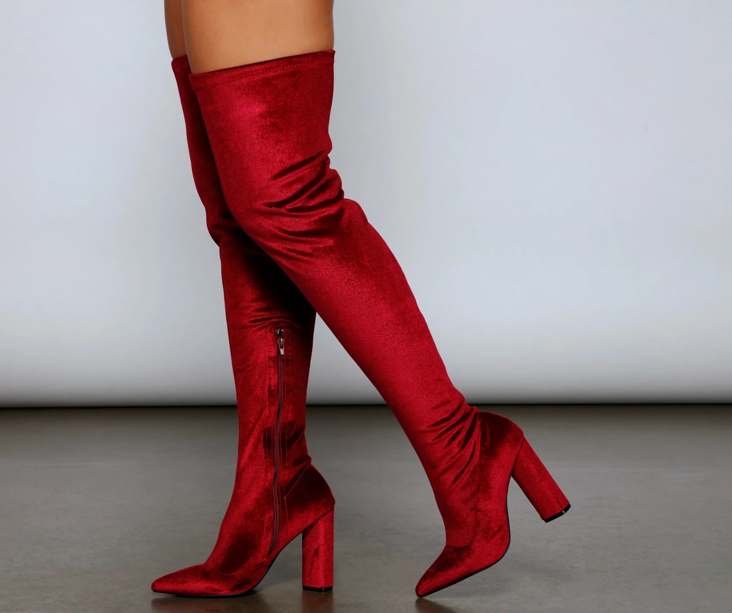 You'll look so chic and luxe in these smooth velvet over-the-knee boots! They feature an on-trend pointed toe, a partial inner zipper closure, a tall block heel, and a form-hugging fit. Style these boots with a little black dress and a sleek clutch.