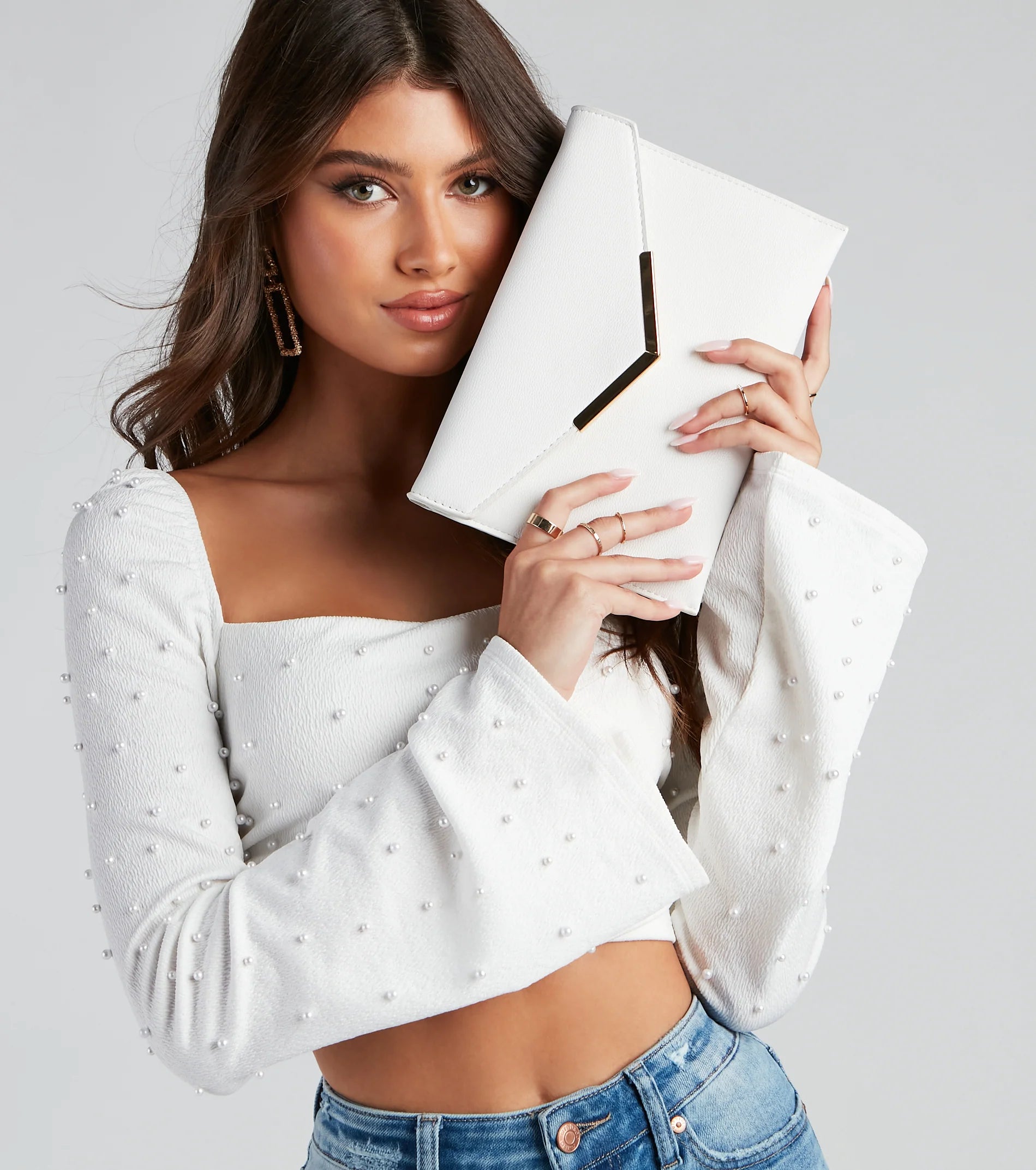 Clean and chic, keep your outfit classy with this essential faux leather clutch featuring an envelope flap with metal trim, snap-button closure, detachable chain-link strap, and a spacious interior with a zipper pocket. Complete the look in a jumpsuit for a lunch with friends.