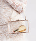 Make a stylish clear statement with this chic box clutch that will elevate your dressy looks. It features a clear design with a rectangular shape, an acrylic material, a metal trim with a top clasp closure, a detachable faux pearl top handle strap, and a detachable chain-link shoulder strap. Style with a lace mini dress and rhinestone earrings.
