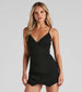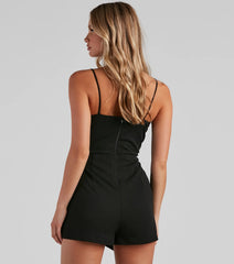 Cause a commotion when you walk in looking so-chic in this crepe skort romper featuring a sleeveless surplice V-neckline, spaghetti straps, and a form-fitting silhouette on an envelope style hem. Complete the look in rhinestone strappy heels for a dressy party.