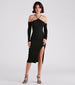 Breeze in looking like a chic contemporary girl in this sweater midi dress! It features an on-trend cold shoulder with adjustable halter spaghetti straps, fitted long sleeves, a bodycon silhouette, and a front-side slit accent. Complete the look with lace-up heels for a dinner date!