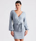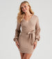 Bring all the cozy vibes this season in this adorable cable knit mini dress! It features a V-neck and back with wrap designs, long balloon sleeves with tapered hems, a high waist with a tie-front accent, and a short, form-hugging fit. Style with knee-high boots.