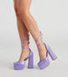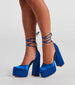 Go ahead, crash the party looking so stunning in these satin platform heels featuring a closed almond toe and ankle, block heel, lace-up straps with self-tie closure, and chunky silhouette. Complete the look in a sassy skater dress.
