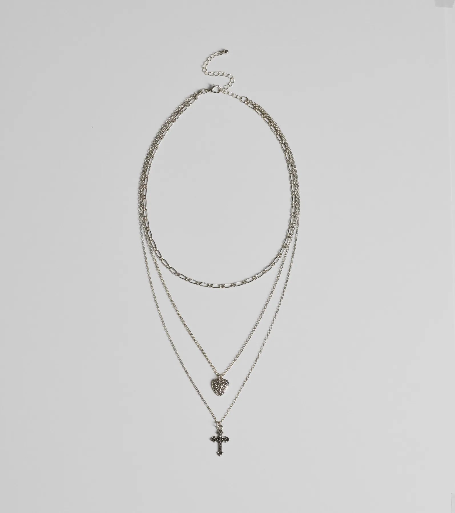 Elevate your style with this layered necklace perfect for accessorizing your outfit. This unique necklace features a layered design with a delicate cross and heart charms. Complete the look in a chic matching set for weekend plans!