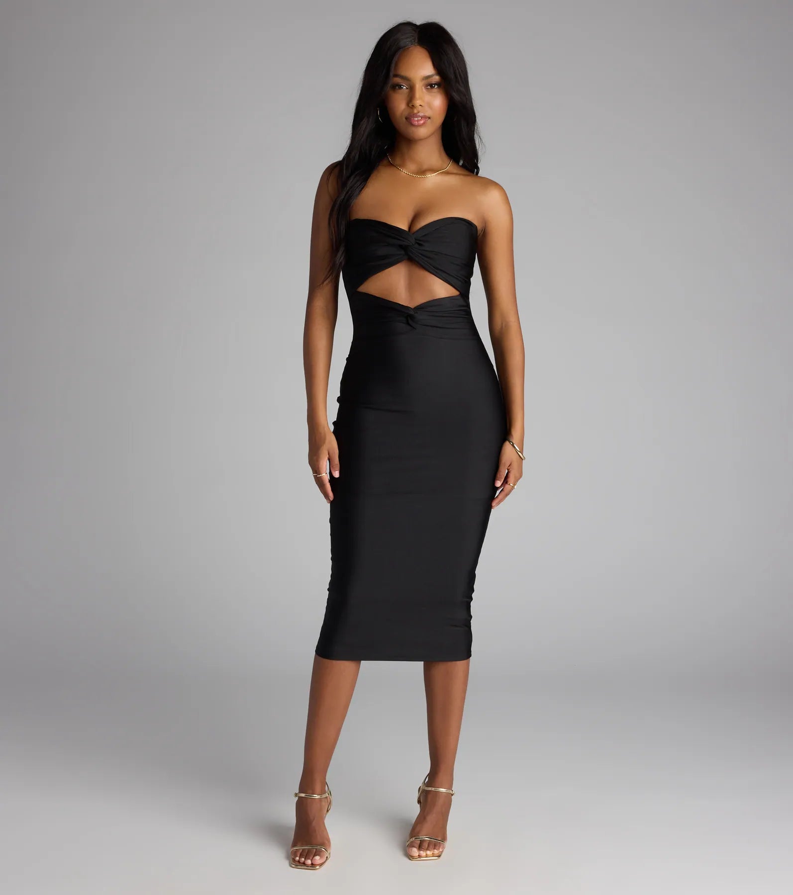 A little cutout never hurt anybody. This strapless midi hugs your curves with a sleek silhouette and underbust cutout made to turn heads at every RSVP.