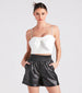 Show off the cutest glamour with this adorable bow-front crop top! It features a sleeveless sweetheart neckline, a bold bow-front design, spaghetti straps with mini rhinestone embellishments for a subtle sparkle, and a fitted, cropped hem. The crepe fabric offers a moderate stretch. Style with a mini skirt and platform heels for a picture-perfect party look!