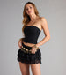 This ruffled lace mini skort is cutesy perfection for your summer outfits! Designed with a drop waist and tiered ruffled overlay, style with a crop top and cowboy boots.