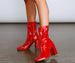 Showcase your diva-style with booties that slay, babe! The booties feature a mid-calf length, an inner zipper closure, a pointed toe, and a block heel. The booties are composed of a faux patent leather material. Complete look with a bustier and a mini skirt.