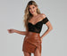 It may be daylight savings, but you can still rock florals at night! This off-the-shoulder bodysuit features short sleeve cuffs, a sweetheart neckline with ruched cups, a corset-style bodice with flexible boning, and hook-eye closures. Composed of a flocked velvet mesh fabric. Style with a leather skirt and mules.