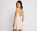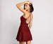 Glow and dazzle in a glitter dress that illuminates the night. This must-have dress features a sleeveless sweetheart neckline with a padded bust, sleek spaghetti straps that lead to a cross-back design, a dazzling lower back rhinestone embellished bar strap, and a mini-length skater skirt with a fit and flare silhouette. The glittering fabric perfectly styles with rhinestone earrings and chrome pumps.