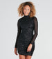 Dazzle like a star in this sequin mini dress to make your grand debut at parties! The mini-length dress features sheer fitted long sleeves, a mock neckline, and a sexy ruched bodycon silhouette that flaunts your figure on sequin embroidered knit fabric. Complete the look in sparkling block heels.