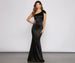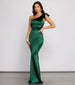 Keep it luxe in the stunning Delana dress that brings the sophistication to your special evening. She features a unique one-shoulder neckline with a charming bow accent on the left shoulder, a floor-length mermaid silhouette, and is composed of a captivating satin-like fabric. Complete your special occasion outfit with rhinestone earrings.
